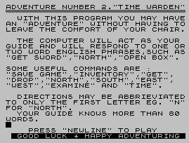In this adventure you play the Time Warden. While you have been away on vacation and the Key of Time has been lost on the planet Syrius 5. You have 250 turns to recover the key before the end of the Universe.